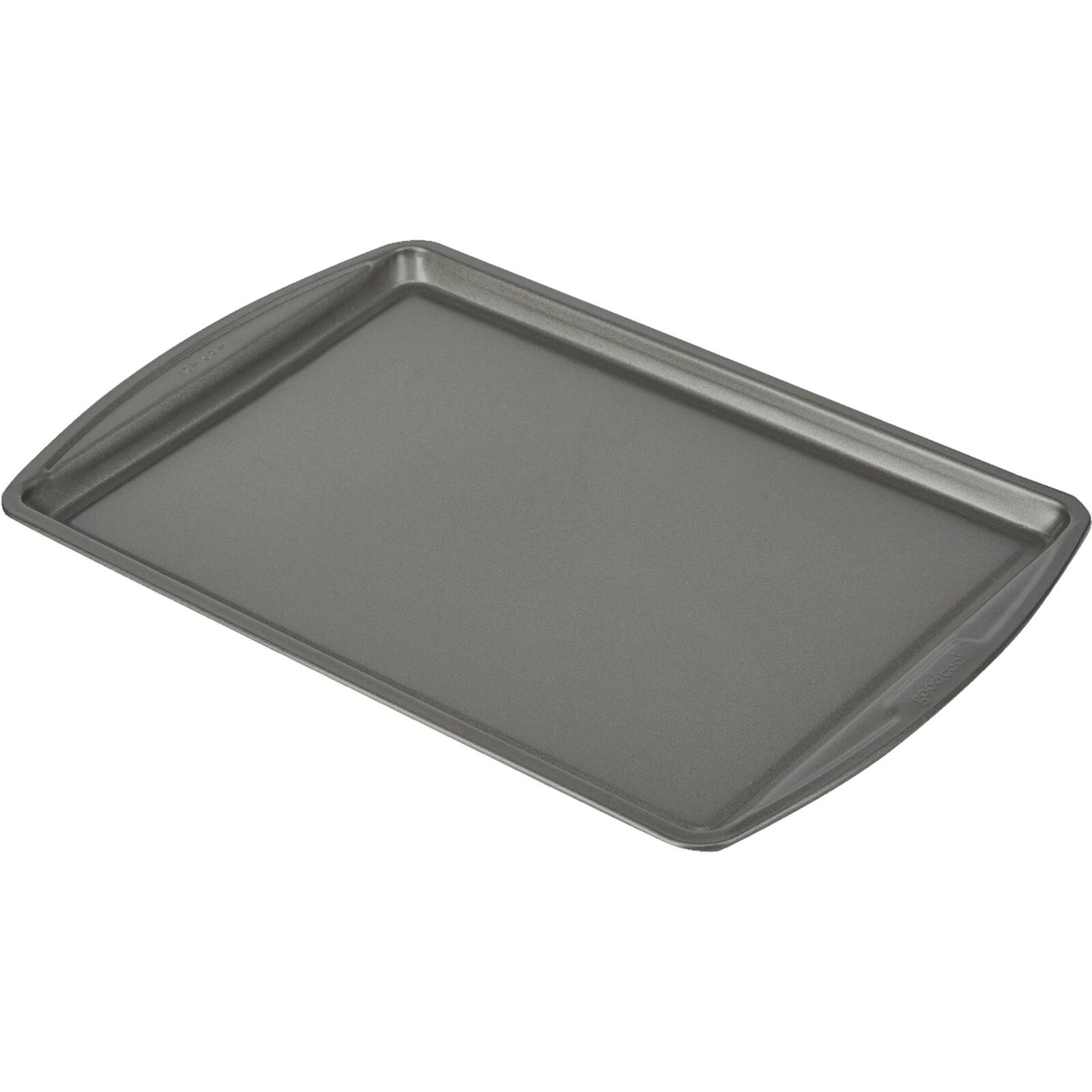 Heavy duty, rectangular steel shallow cookie sheets have a non-stick coating. Metal utensil safe. Dishwasher safe.